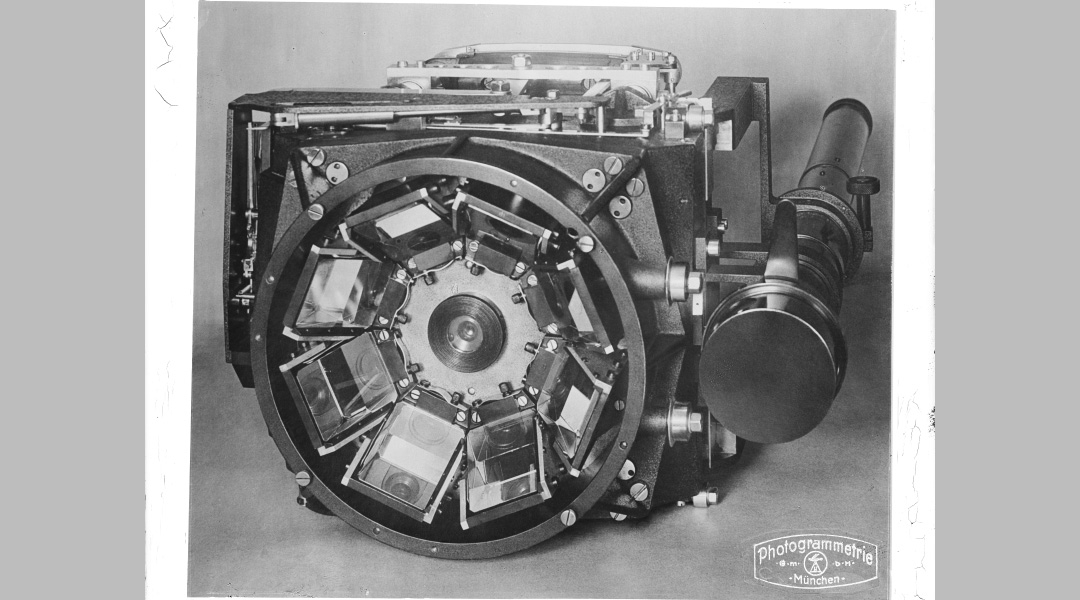 Die Panoramakamera besitzt neun Objektive, die zusammen ein umfassendes Bild des fotografierten Bereichs ergeben. Das Objektiv in der Mitte macht eine Senkrechtaufnahme, die übrigen acht Objektive liefern Schrägaufnahmen. Diese Kombination ermöglicht es, ein weites Sichtfeld abzubilden und dabei Details präzise festzuhalten. Mit einem speziellen Umbildgerät wird dann aus den neun getrennten Bildern ein zusammengesetztes Luftbild, in dem man auch messen kann.